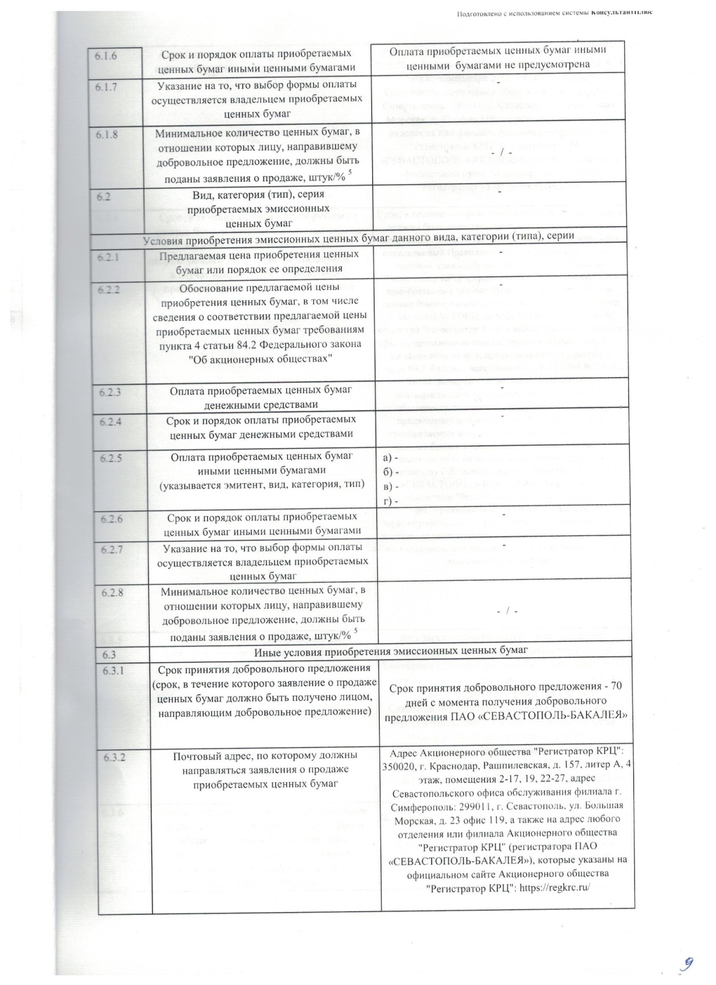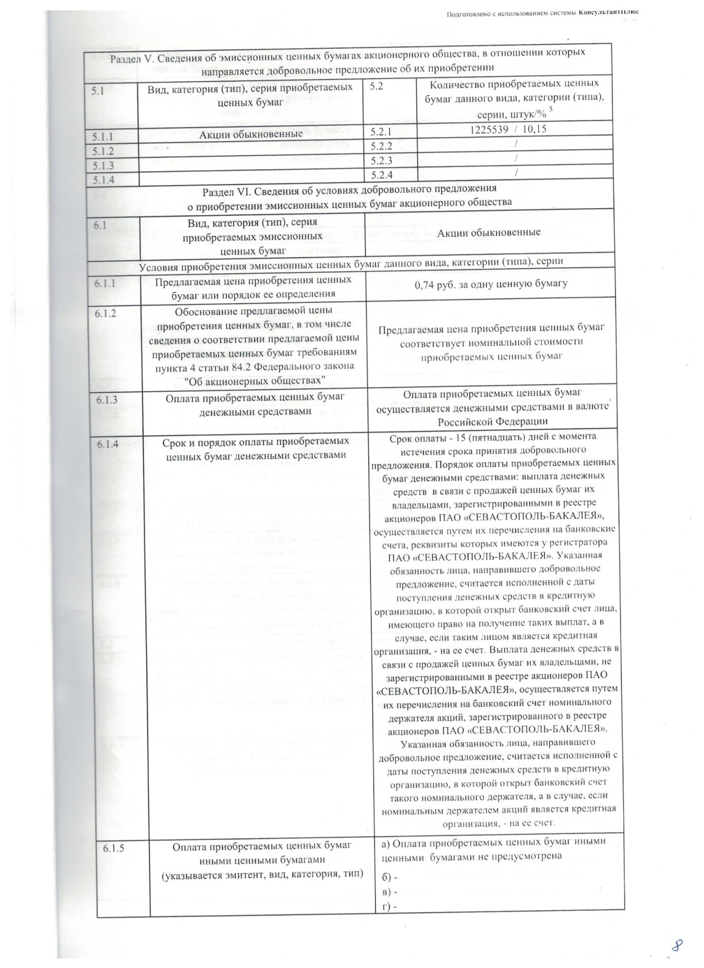 - Предлагаемая в добровольном предложении цена приобретения в размере 0,74 руб. за одну обыкновенную акцию ПАО «СЕВАСТОПОЛЬ-БАКАЛЕЯ» соответствует номинальной стоимости приобретаемых ценных бумаг;