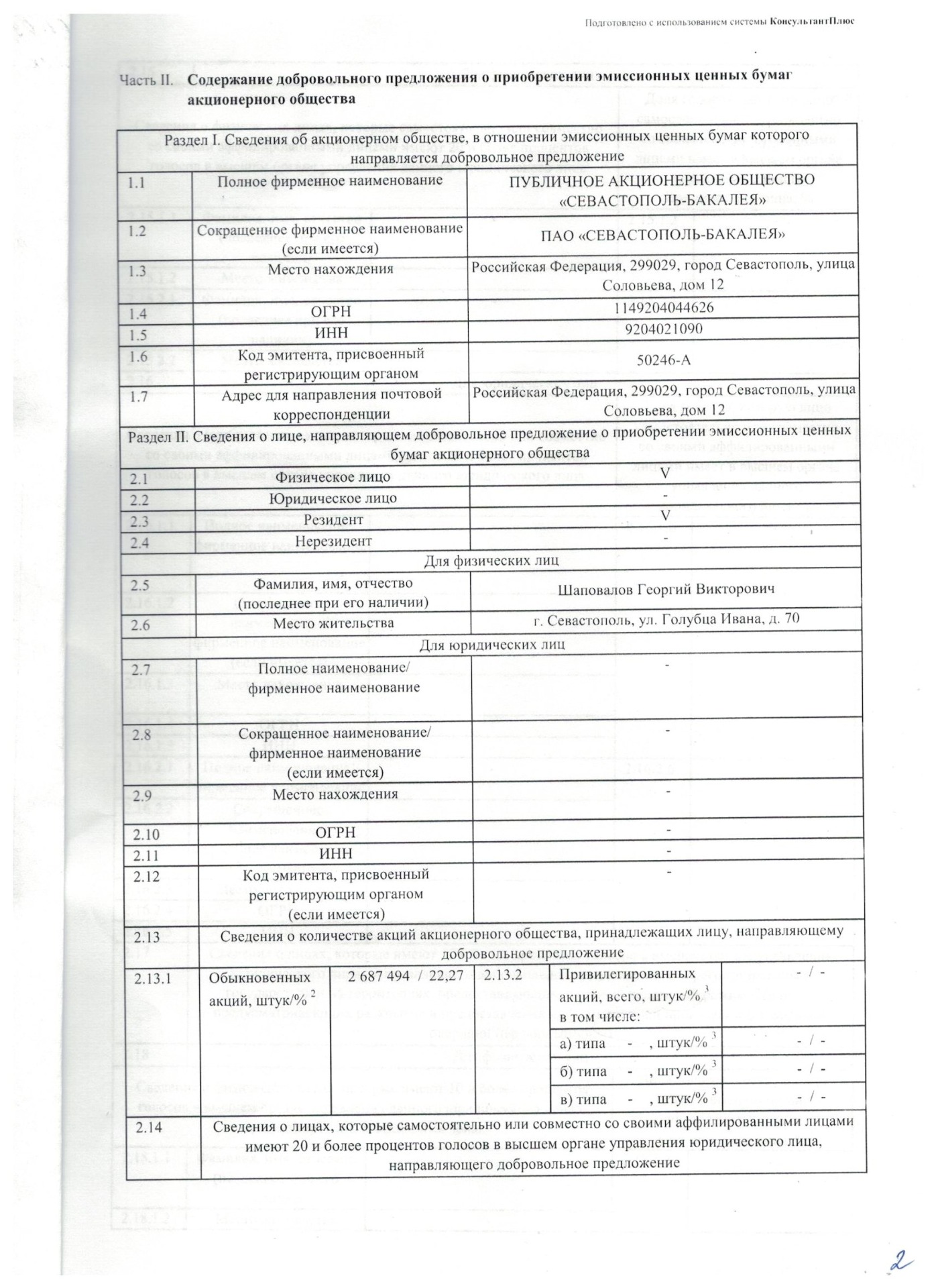 Наблюдательный совет ПАО «СЕВАСТОПОЛЬ-БАКАЛЕЯ», рассмотрев 08.09.2025 (протокол № 30/2025 от 08.09.2025) добровольное предложение Шаповалова Георгия Викторовича о приобретении ценных бумаг ПАО «СЕВАСТОПОЛЬ-БАКАЛЕЯ», поступившее в ПАО «СЕВАСТОПОЛЬ-БАКАЛЕЯ» 01.09.2025, решил принять следующие рекомендации в отношении добровольного предложения Шаповалова Георгия Викторовича о приобретении ценных бумаг ПАО «СЕВАСТОПОЛЬ-БАКАЛЕЯ» (далее – добровольное предложение):