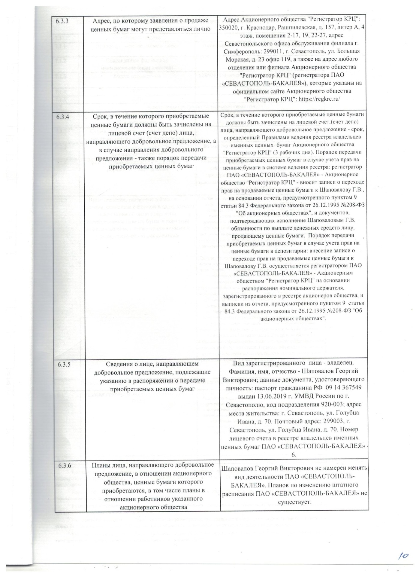 - Шаповалов Георгий Викторович не намерен менять вид деятельности ПАО «СЕВАСТОПОЛЬ-БАКАЛЕЯ», планов по изменению штатного расписания ПАО «СЕВАСТОПОЛЬ-БАКАЛЕЯ» не существует, в связи с чем изменение рыночной стоимости обыкновенных акций ПАО «СЕВАСТОПОЛЬ-БАКАЛЕЯ» после их приобретения Шаповаловым Георгием Викторовичем не предвидится.